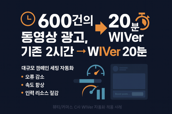 메타 동영상 광고 약 600건을 동시에 등록해야 하는 대규모 캠페인 상황에서, 기존에는 각 광고그룹과 소재를 수동으로 세팅해야 했기 때문에 최소 2시간 이상이 소요되었습니다. 특히 광고소재별 메타 데이터 입력, 썸네일 및 문구 매칭 등 반복 작업이 많아 인력 리소스 부담이 컸습니다. 하지만 위버(WIVer)의 자동화 프로세스를 적용한 결과, 동일한 규모의 작업이 약…